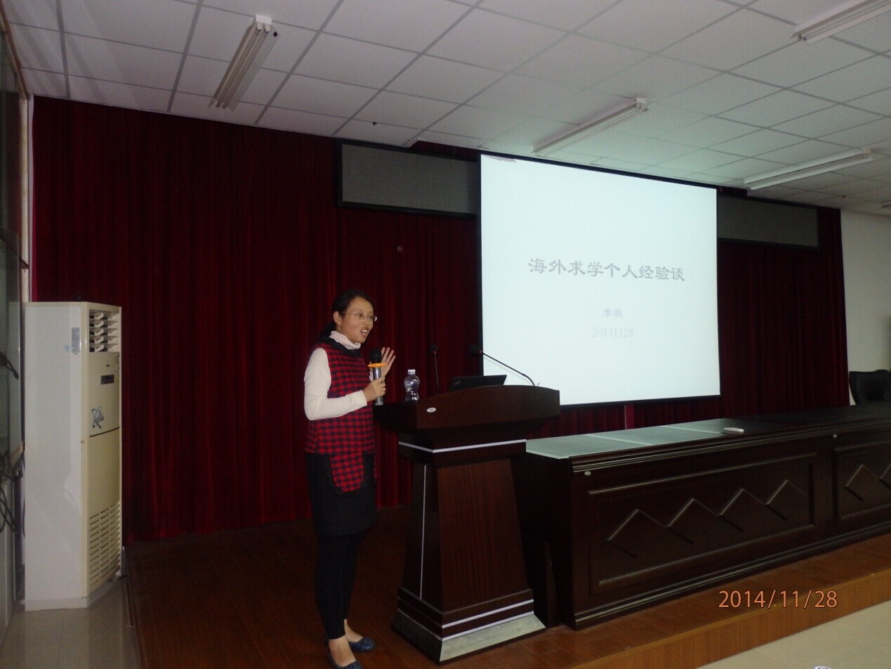 接着,洪堡教育奖学金获得者李毅教授以“海外求学个人经验谈”为主题做了一场精彩的报告。李毅教授针对出国攻读博士学位或从事博士后研究的奖学金进行详细的分类,并对各类奖学金的申请流程、申请的难易程度举例进行了分析,图文并茂、生动有趣地讲述了自己海外访学的经历和感受;随后,欧盟玛丽居里奖学金获得者林梅金研究员,以“也谈出国留学申请”为题,从“我的申请故事”、“影响申请的主要因素”、“申请材料的完美化”和“如何申请”等四个方面进行了详细的介绍。从申请的要求,到如何完美拿到自己心仪的offer,林梅金研究员热情洋溢地与同学们分享了自己的出国研修历程和体会。