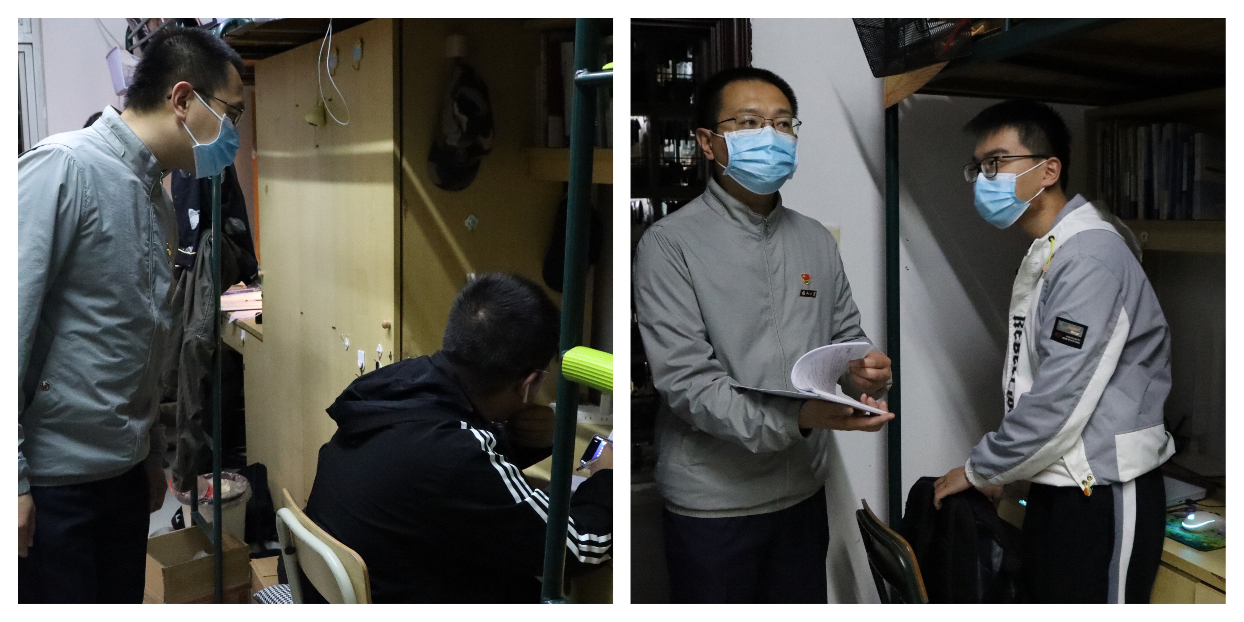特殊时期,全体政工干部第一时间入住校园,多次到宿舍找学生谈心谈话。学院党委常凯副书记深入学生宿舍了解同学们生活物资储备、在线课程的听课状态等情况,关心疫情对同学们实习就业及考研复试的影响,并向我院学子传达学校疫情防控相关规定。