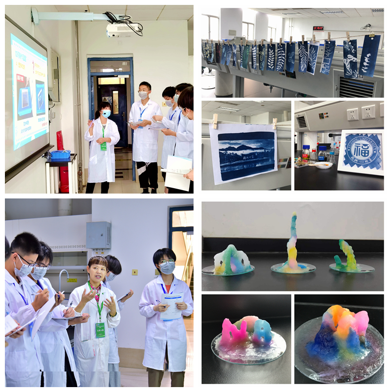 实验环节总是科普夏令营的重头戏。在为期3天的活动里,实验中心的老师们根据学生的知识水平,安排了“夏至蓝晒”和“点水成冰、滴水成山”两个科普实验以及“天然彩虹酸碱指示剂——花青素”和“水的电解——电解反应的探究实验”两个专业实验。实验开始前,实验中心的许紫婷老师对同学们进行实验室安全培训,用通俗易懂的图片和文字,介绍了进行化学实验需要遵守的安全规定。“夏至蓝晒”实验带领同学们体验古老的摄影工艺,利用阳光、水和神奇的化学试剂(柠檬酸铁铵溶液和铁氰化钾溶液),以及同学们的想象力和创造力,创作独一无二的蓝晒作品。“点水成冰、滴水成山”实验向同学们展示了在室温下点水就能瞬间结“冰”,倒水就能迅速堆成“冰山”,而且“冰”还不易融化的神奇现象,并揭示了其中的奥秘。利用这一原理,同学们化身“冰雕师傅”,设计并塑造自己的“冰雕作品”。两个科普实验不仅让同学们解锁了科学知识,还体验了艺术创作的乐趣。“天然彩虹酸碱指示剂——花青素”实验,同学们利用常见的蔬菜紫甘蓝制作酸碱指示剂,再利用亲手做的指示剂,测定生活中常见物质(肥皂水、雪碧、苏打水等)的酸碱性。“《水的电解——电解反应的探究实验》”同学们通过改变不同的条件,探究了电解反应需要的条件,以及电解产物的量与电流和时间的关系。两个专业实验,同学们从熟悉的物质入手,体验实验探究的乐趣,并从中体会细心观察、及时记录的重要性。