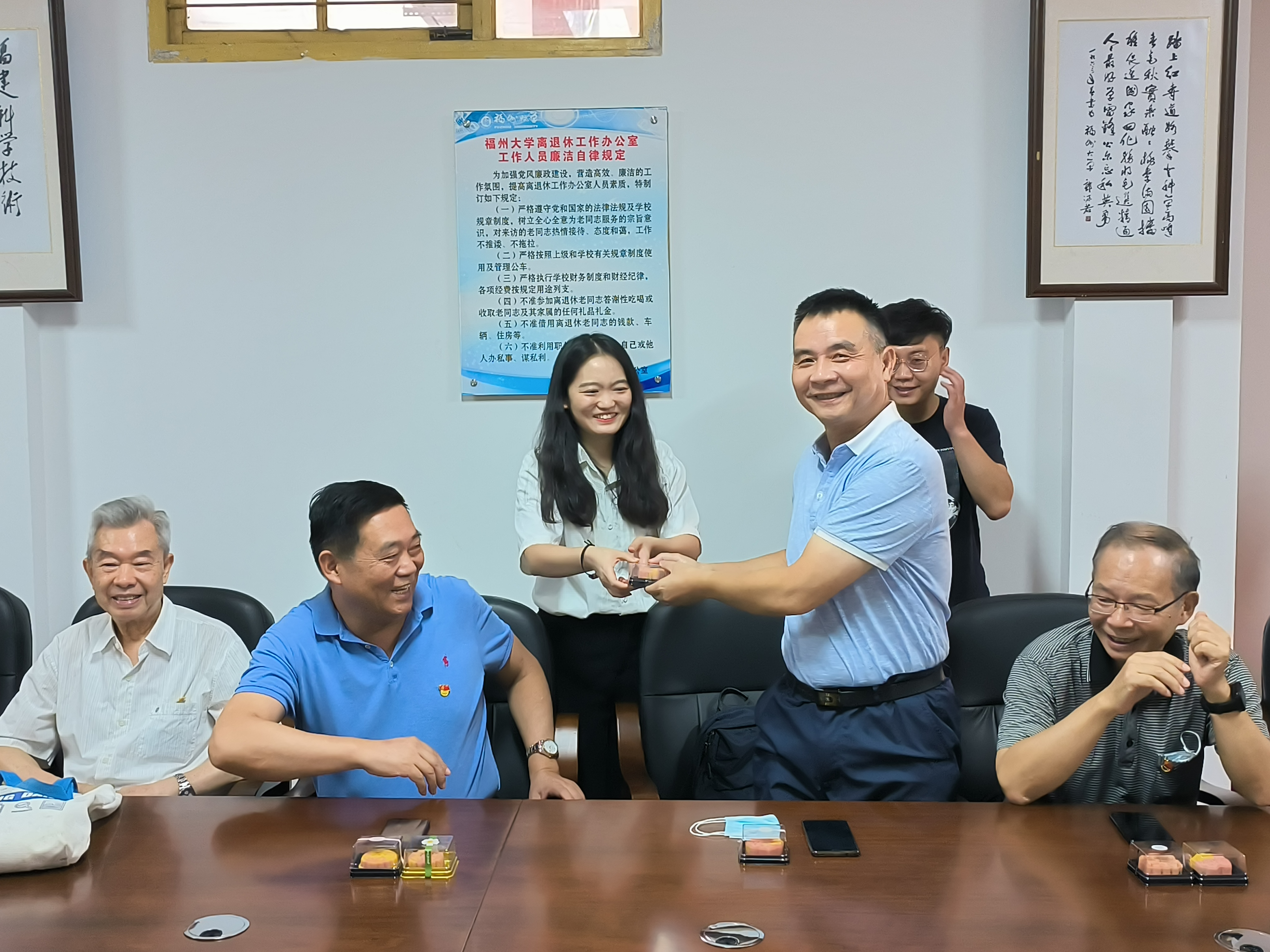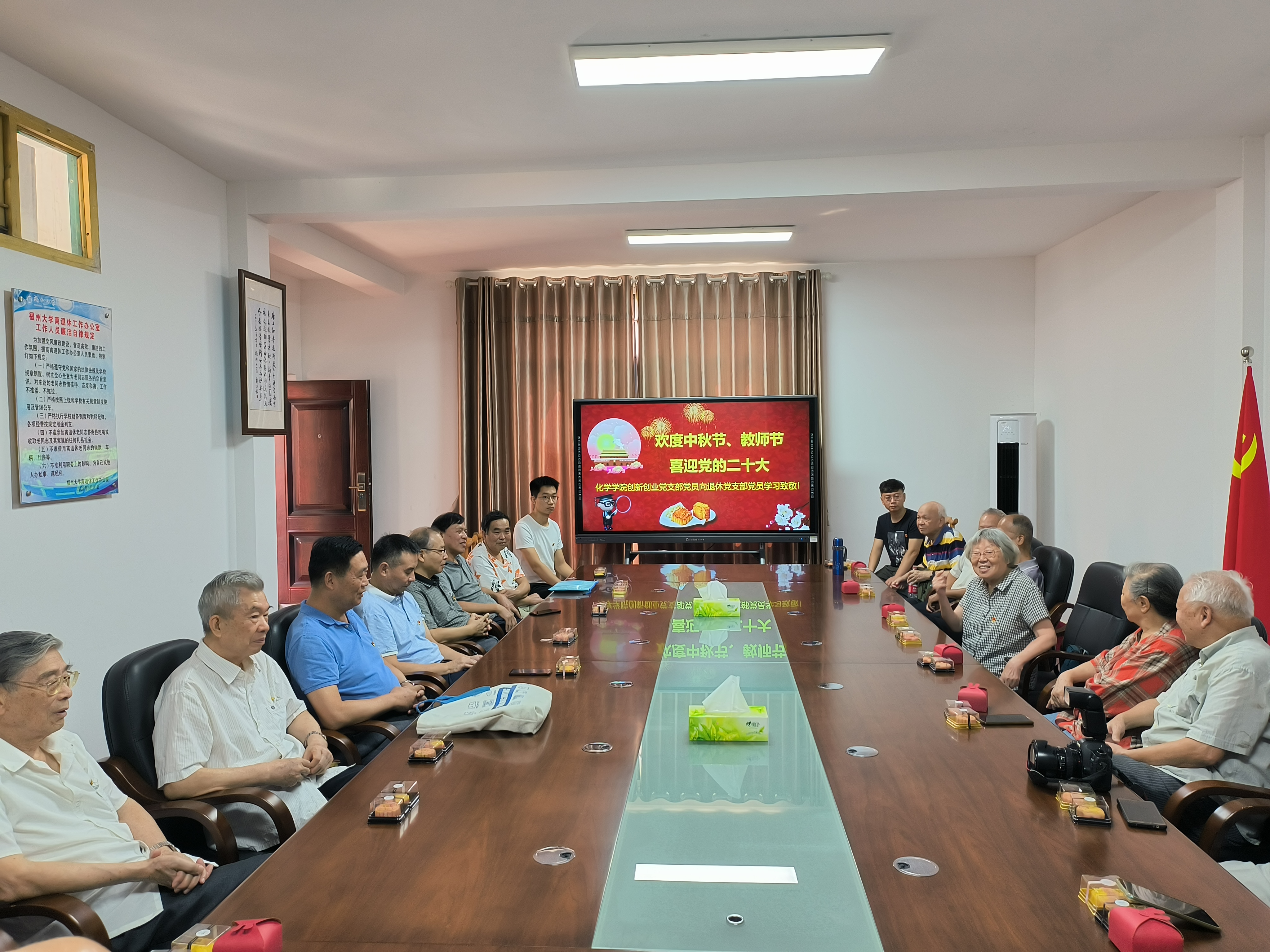 9月9日上午,创新创业党支部部分党员来到怡山校区,与学院退休党支部的老教授们一起欢度中秋、教师节,喜迎党的二十大。学院党委张泓书记、常凯副书记参加了活动。为表达对退休党员的敬意,创新创业党支部三位博士生党员为在场每一位老同志献上自己动手制作的敬老敬师月饼,祝他们中秋节、教师节快乐,身体健康!老教授们纷纷发言,回顾了学院的发展史,特别是研究生教育的发展历程,对进一步加强学科建设和研究生教育提出了宝贵的意见建议,鼓励博士生继续发扬老一辈福大人的精神,努力拼搏,不负时代。祝学院各项事业更上一层楼!