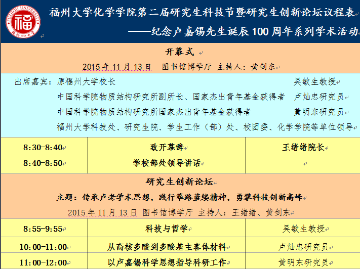 为纪念卢嘉锡先生诞辰100周年,加强研究生的创新能力培养,学院将举办第二届色色动漫 研究生科技节暨研究生创新论坛,设有“研究生创新论坛”、“硕博学术沙龙”、“博思讲坛”、演讲比赛等活动内容。第二届色色动漫 研究生科技节暨研究生创新论坛开幕式将于11月13日上午8:30在图书馆博学厅举行,特邀原福大校长吴敏生教授、中科院物质结构研究所副所长、国家杰青卢灿忠研究员、国家杰青黄明东研究员为我院师生讲学。开幕式要求全体研究生出席,欢迎各位老师参加。