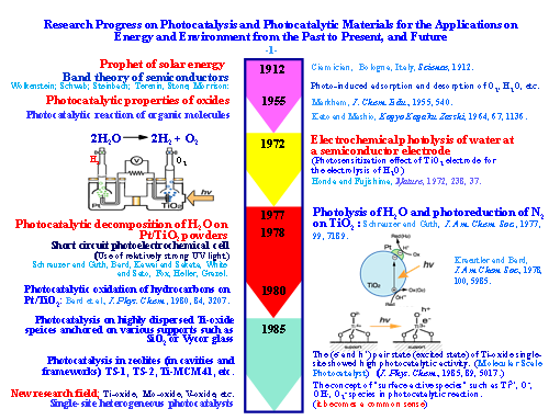 Environmentally harmonious, clean and safe scientific technologies to address energy needs as well as pollution and climatic change are the recent subject of much research. Photocatalysis, in which the abundant and clean solar energy could be harnessed, would be a major advance in the development of sustainable, non-hazardous and economic technologies. As shown in below figure (it shows only the first beginning stages), in the past half century, many scientists have studied the effect of UV-Visible light irradiation on various inorganic and organic semiconducting heterogenous catalysts in relation to the decomposition of H2O to produce clean H2 and O2, elimination or degradation of various pollutants, organic transformation, CO2 reduction with H2O to produce useful substances, photo-induced superhydrophilicity and dye sentitized solar cells. Since then, many chemists have further invesigated the development of various effective and efficient photocatalytic materials, especially, which decompose H2O into H2 and O2 under sunligh irradaition with high effficiency, and its practical realization is just around the corner.