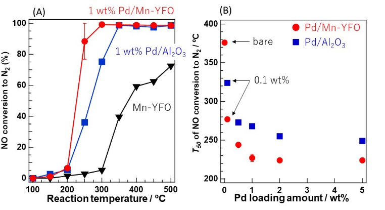 activity and reduced precious metal use. Such catalysts must undergo simultaneous CO/ hydrocarbon oxidations and NO reduction. A Pd catalyst supported on Mn-modified hexagonal YbFeO3 (Pd/Mn-YFO) exhibited extremely high activity at low temperature via a Mars-van Krevelen (MvK) mechanism involving lattice oxygen and oxygen vacancy site in the catalyst support.