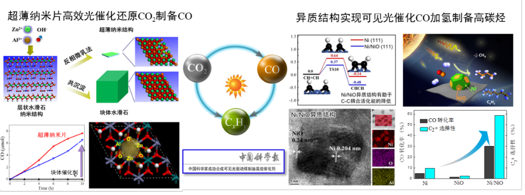 光催化技术被认为是解决能源问题的最有应用前景的技术之一。发展新型高效的光催化材料是该技术实用化的关键。水滑石基纳米结构材料因其电子结构可调、价格低廉等众多优势,而成为光催化领域的研究热点。近三年来,我们研究团队通过在水滑石表面引入缺陷结构增加活性位,增强了对反应物CO2等的吸附和活化,进而提升了催化活性。另外,通过构造界面活性位,调控了中间物种的反应路径,从而实现了高附加值产品的高选择性合成。