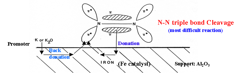 Fig. 1. Elucidation how to dissociate a strong N-N triple bond of N2 to form N-atoms on Fe catalysts and the role of promoter of K (or K2O). Nobel Prize in Chemistry; Prof. Fritz Haber in 1918, Prof. Carl Bosch in 1931, and Prof. Dr. Gerhard Ertl in 2007.