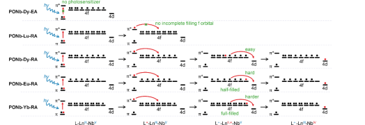 更重要的是,该团队通过精心设计一系列概念验证模型(PONb-Dy-EA,PONb-Lu-RA,PONb-Dy-RA,PONb-Eu-RA,PONb-Yb-RA),通过分析它们的电子构型和光致变色性能,揭示了光诱导电子从光敏有机磷酸盐(D),通过Ln的未占据的4f轨道(f),转移到NbV电子受体(A)的独特的D-f-A电子转移机制(图2)。具体的过程是,研究者首先通过对比两种不同磷酸配体修饰的化合物PONb-Dy-EA和PONb-Dy-RA的光致变色现象,确定了只有含共轭体系的双膦酸配体才可以作为光敏电子供体,表明EA为电子给体(D);其次研究者进一步分析PONb-Eu-RA、PONb-Yb-RA和PONb-Lu-RA的同构化合物在相同的条件下辐照后的变色行为,表观着色程度和变色速度均证明了EuII,≠的半填充4f7和YbII,≠的全填充4f14的稳定电子组态均抑制了PET过程,而PONb-Lu-RA化合物因LuIII的4f电子层全满不可接收光敏电子所以不表现出变色现象,证明了稀土未占据4f轨道作为电子转移的桥梁(f);最后,XPS价态分析证明了NbIV的存在,UV-Vis展示了NbIV到NbV到价间电荷转移(IVCT)的吸收,这些结果说明了Nb为电子受体(A)。