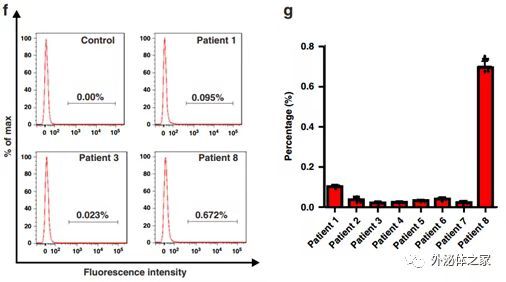 此外,为了进一步测试MSN-AP(用Cy-5标记)结合人癌症外泌体的特异性,在医院伦理委员会批准后,该研究向8例肺癌患者的血液样本中添加了MSN-AP(终浓度为40 µg/mL),并在样品孵育/离心过程后使用流式细胞仪检测了MSN-AP结合的外泌体。基于Cy5荧光信号,通过流式细胞术在患者血液中鉴定并定量了MSN-AP结合的EGFR外泌体。每个样品分为3-5个部分进行重复测量。EGFR阳性外泌体的数量似乎与患者的癌症分期密切相关。例如,晚期患者8与II期患者相比,其外泌体水平明显更高。