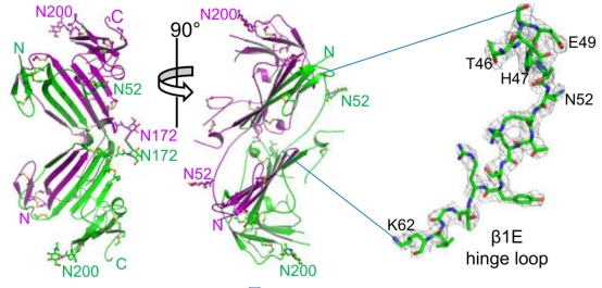 图1. 尿激酶受体形成N端交换的二聚体(两条链分别以绿色和紫色显示)