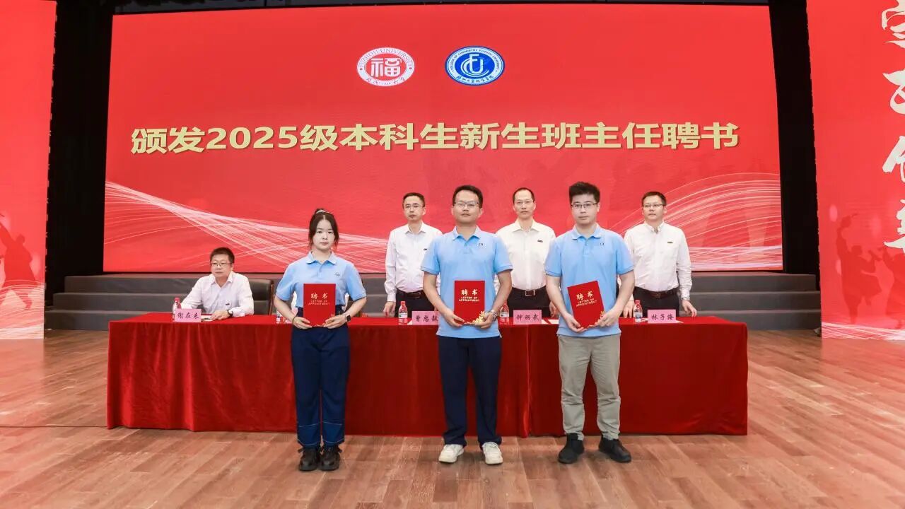 曾忠毅书记、钟羽武院长、林子俺副院长为班主任颁发聘书。新生班主任是新生启航路上的第一盏灯,他们将用专业指引方向,用关怀温暖心灵,引领同学们坚定前行。
