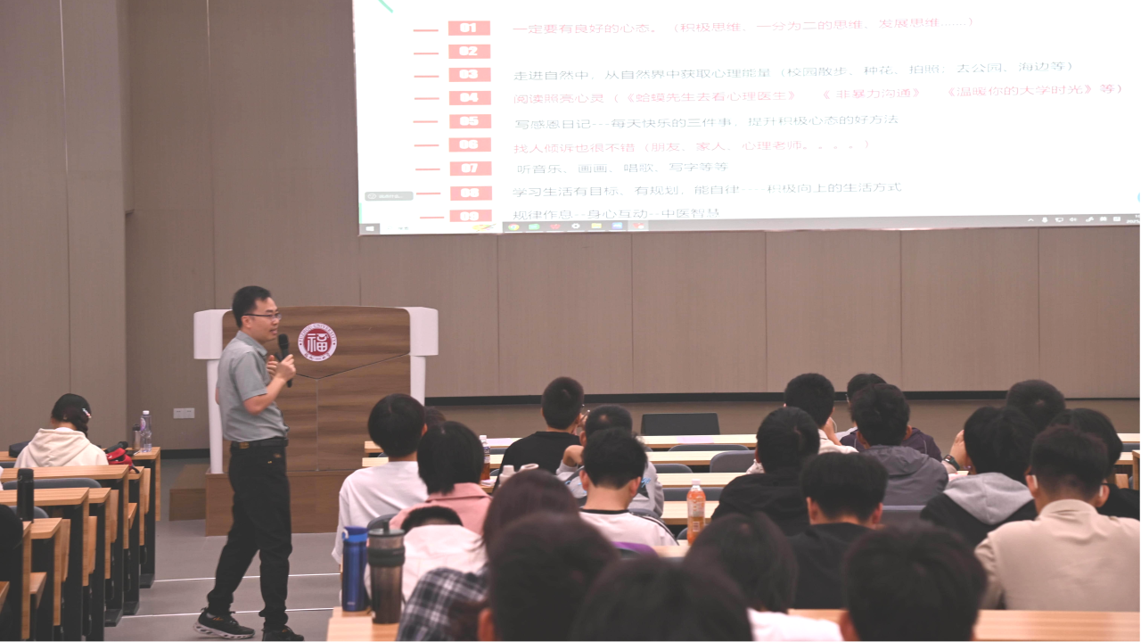 丁闽江教授结合典型案例,指出心理委员工作的核心在于“温暖的陪伴”,强调要主动关注身边可能存在心理困扰的同学,及时给予关心与支持。在系统讲解心理委员所需掌握的基础专业知识之前,丁教授首先鼓励大家培养“积极、阳光、自助、助人”的健康心态,为后续的实务工作奠定心理基础。