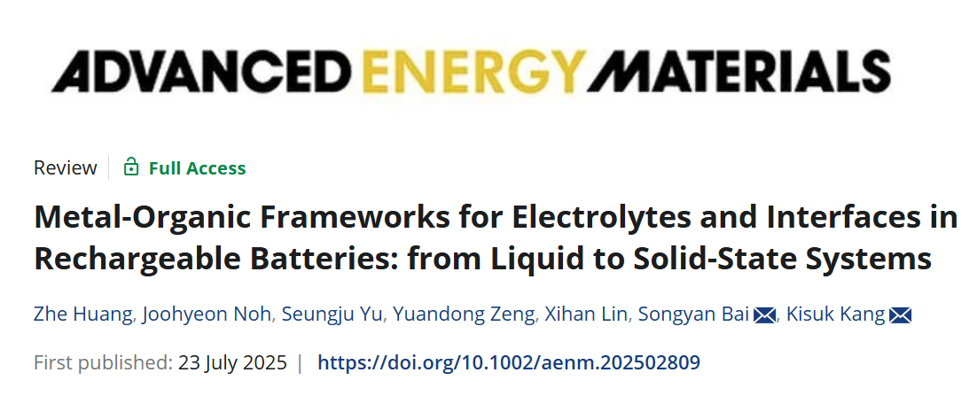 柏松延教授课题组联合首尔国立大学Kisuk Kang教授团队在国际知名期刊《Advanced Energy Materials》上发表了题为“Metal-Organic Frameworks for Electrolytes and Interfaces in Rechargeable Batteries: from Liquid to Solid-State Systems”的综述论文。该综述围绕金属–有机框架材料(Metal–Organic Frameworks, MOFs)在先进可充电电池中的应用展开,系统总结了其在液态、准固态到全固态电解质体...