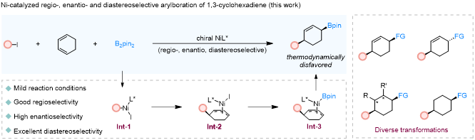 近日,我院宋秋玲教授课题组在国际权威期刊《J. Am. Chem. Soc.》上发表题为“Ni-Catalyzed Enantioselective Arylboration of 1,3-Cyclohexadiene”的研究成果。该研究发展了一种新颖高效的镍催化体系,利用易得的芳基碘化物和双联频哪醇硼酸酯(B₂pin₂),实现了1,3-环己二烯的高区域、对映及非对映选择性芳基硼化反应,为合成具有重要应用价值的手性硼化1,4-顺式-环己烯衍生物提供了直接高效的路径。多取代六元环结构多样...