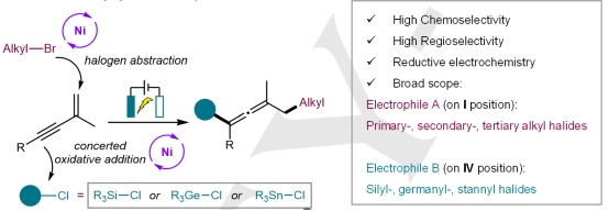 联烯不仅是多种有机转化中的重要中间体,而且在天然产物、药品和分子材料中广泛存在,因此一系列方法被成功开发来合成这类化合物。然而,传统的两组分反应存在一系列缺点,比如需要苛刻的反应条件和需要预先官能团化的不饱和起始原料,这极大地限制了其广泛应用。虽然目前可以通过多组分反应对1,3-烯炔进行氧化还原中性双官能团化来构建多取代联烯,但对空气敏感的有机金属亲核试剂的依赖和对高温的要求仍是较大的缺点。因此,...